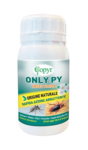 ONLY PY es un insecticida líquido concentrado emulsionable, exclusivamente a base de Piretrinas, sustancia activa de origen natural. ONLY PY se caracteriza por su acentuada efectividad de derribo (knock down) y, por tanto, por su rapidez de acción elevada contra los insectos rastreros (cucarachas y hormigas), los voladores (moscas y mosquitos, incluido el mosquito tigre) y los insectos de los géneros alimenticios. Merced a sus características, las Piretrinas también se pueden usar en zonas sensibles; a saber: escuelas, hospitales, zonas verdes e industria alimentaria. ONLY PY es efectivo contra: