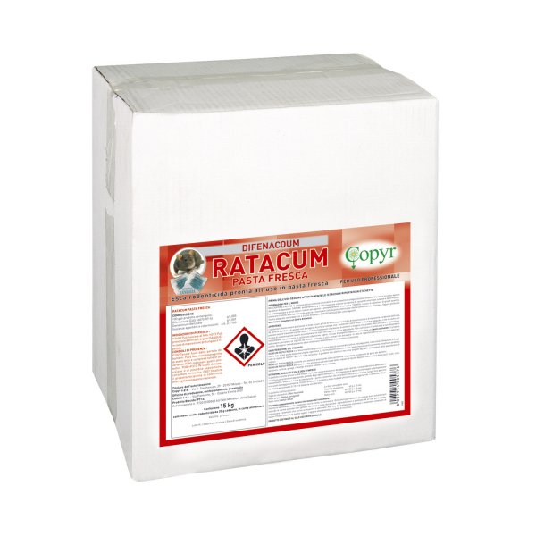 RATACUM PASTA FRESCA es un cebo rodenticida, listo para usar, a base de Difenacoum, una sustancia activa anticoagulante, que resulta efectiva contra el ratón común o doméstico (Mus musculus), la rata de alcantarilla (Rattus norvegicus) y la rata negra (Rattus rattus), incluso después de una única ingesta. La formulación consiste en una pasta apetitosa para las especies de roedores indicadas. El producto no alarma ni suscita sospechas entre los otros miembros de la población de roedores. RATACUM PASTA FRESCA contiene una sustancia amarga idónea para prevenir la ingestión accidental por parte de los niños. RATACUM PASTA FRESCA se puede usar en el interior y alrededor de edificios industriales (incluidos los almacenes, los depósitos y las bodegas de los barcos), rurales, no industriales, viviendas, sótanos, garajes, trasteros, jardines y zonas aledañas pertinentes. Al aire libre y en las zonas abiertas. ORGANISMOS DIANA - ratón común o doméstico (Mus musculus), tanto jóvenes como adultos, rata de alcantarilla (Rattus norvegicus), tanto jóvenes como adultas, rata negra (Rattus rattus), tanto jóvenes como adultas.