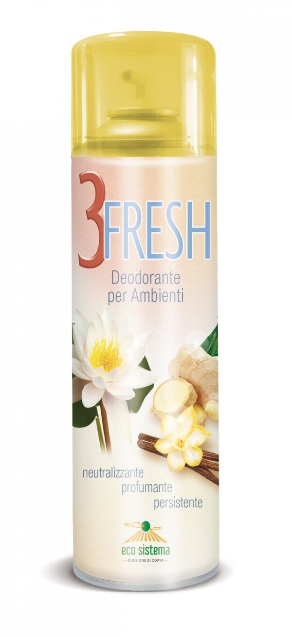 3FRESH Deodorante aerosol per ambiente alla fragranza di Vaniglia & Zenzero La linea deodoranti per ambienti 3Fresh si distingue dai normali deodoranti perché composta da un’alta concentrazione di essenze pure combinate con molecole fissative e desodorizzanti 3Fresh ha come caratteristica 3 fasi combinate: 1a FASE PROFUMANTE SUPERIORE 2a FASE FISSATIVA A LUNGA PERSISTENZA 3a FASE NEUTRALIZZANTE