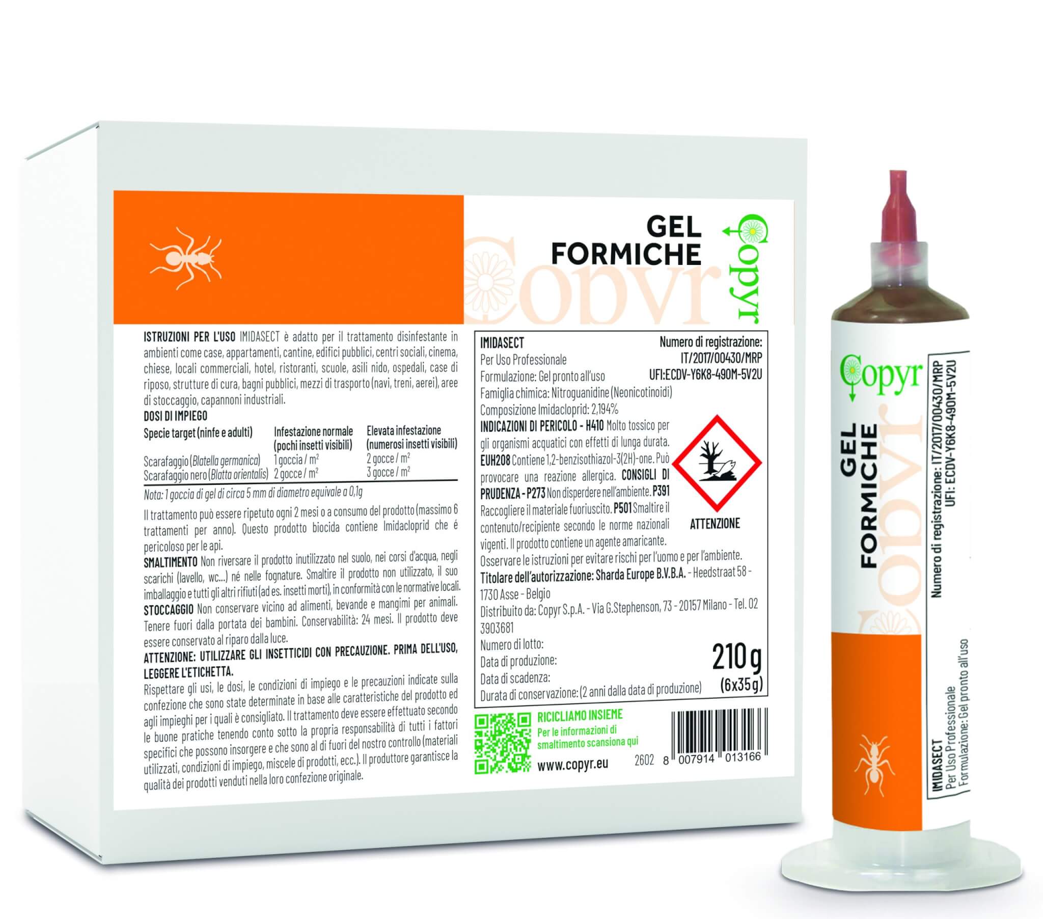 GEL FORMICHE è adatto per il trattamento in ambienti interne ed esterni intorno agli edifici. Insetti bersaglio: Formica faraone (Monomorium pharaonis), formica argentina (Linepithema humile), formica nera dei giardini (Lasus niger). Consigliato per i seguenti usi: Locali domestici: comprese le cucine; Locali di movimentazione degli alimenti: lavorazione (manifatture alimentari, cucine, macelli, ecc..); stoccaggio (rivendite di generi alimentari, magazzini, depositi di materie prime, silos, tranne dove viene immagazzinato il grano, ecc..); preparazione (ristoranti, cucine industriali, ecc.). Edifici pubblici: aree costantemente frequentate tra cui reparti ospedalieri, hotel, bagni pubblici, edifici municipali, chiese, sale, centri sociali, cinema, ecc..