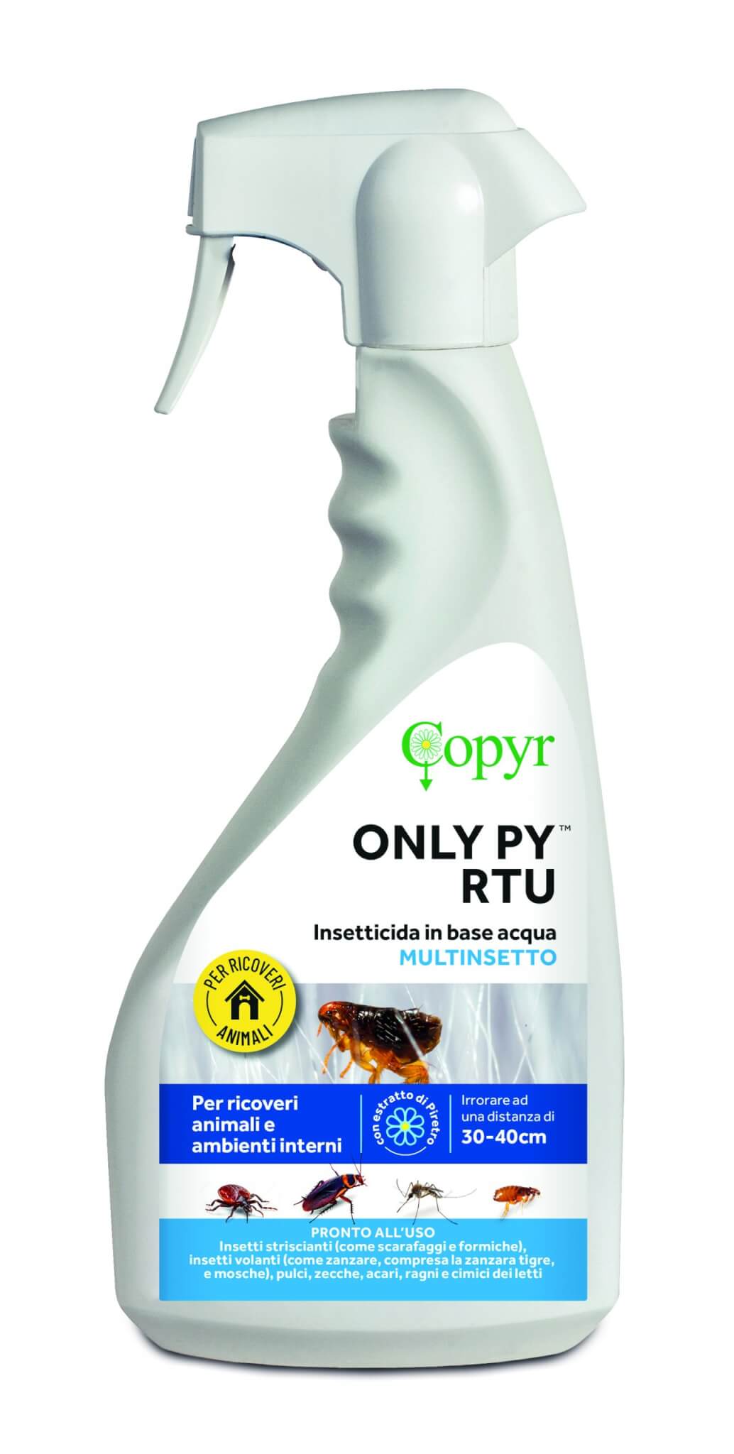 ONLY PY™ RTU è un insetticida-acaricida liquido pronto all’uso in solvente acquoso, a base di sole Piretrine, sostanza attiva di origine vegetale. ONLY PY™ RTU è caratterizzato da una spiccata efficacia abbattente (knock down) e quindi da un’elevata rapidità d’azione contro insetti striscianti (come scarafaggi e formiche), insetti volanti (come zanzare, compresa la zanzara tigre, e mosche), pulci, zecche, acari, ragni e cimici dei letti. Le caratteristiche delle Piretrine ne consentono l’utilizzo anche in aree sensibili come scuole, ospedali e industrie alimentari. ONLY PY™ RTU è efficace contro: • insetti striscianti e volanti in genere, pulci, zecche, acari, ragni e cimici dei letti. ONLY PY™ RTU è impiegabile in: • industrie alimentari: pastifici, panetterie, pasticcerie, ristoranti, bar, mense • magazzini e silos (in assenza di derrate alimentari) • ricoveri per animali (impiegabile in aziende agro-zootecniche biologiche) • case, uffici, negozi, alberghi, campeggi, villaggi turistici • scuole, asili e ospedali • mezzi di trasporto: navi, treni, autobus, container in assenza di derrate alimentari • industrie in genere