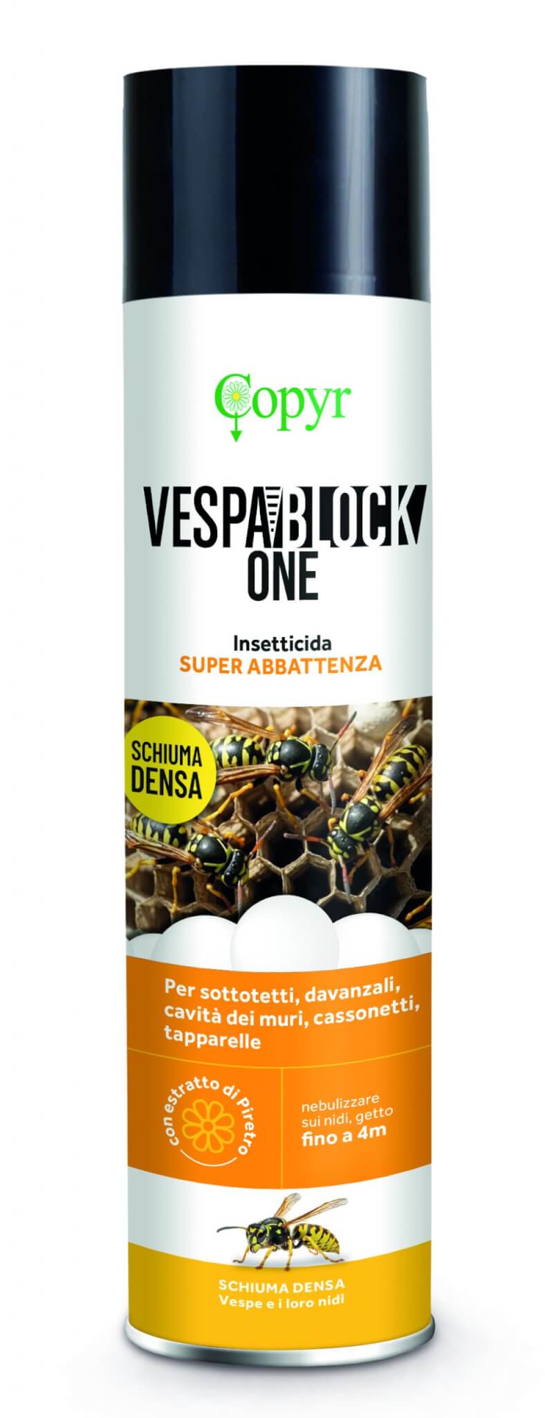 VESPABLOCK™ONE è un aerosol insetticida a forte azione abbattente a base di Piretrine di origine vegetale per uso domestico e civile. Le Piretrine di origine vegetale conferiscono al prodotto un elevato effetto abbattente (knock down), la presenza del Piperonil Butossido potenzia l’efficacia del trattamento provocando, dopo pochi secondi, la morte di vespe presenti nei nidi. La particolare formulazione schiumogena è appositamente studiata per avvolgere il nido, con una densa schiuma, in modo da impedire agli insetti la fuga ed aumentare il tempo di contatto con l’insetticida. Grazie alla specifica formulazione ed alla speciale valvola di erogazione, sviluppata per raggiungere i 4 metri di getto, è possibile trattare in sicurezza i nidi di vespe solitamente posizionati in punti difficili da raggiungere (sottotetti, davanzali, cavità dei muri, cassonetti tapparelle).